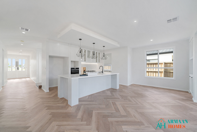 This Hampton style home designed peace in mind. 45 square area of house offers a grand open living floor plans with great size alfresco, Lounge at entrance and theatre room. Herringbone hybrid flooring and fire place couple with 2 Pac kitchen and a bar provide a relaxation like no other. First floor offers a great size entrainment game and four bedrooms to fulfill needs of growing family